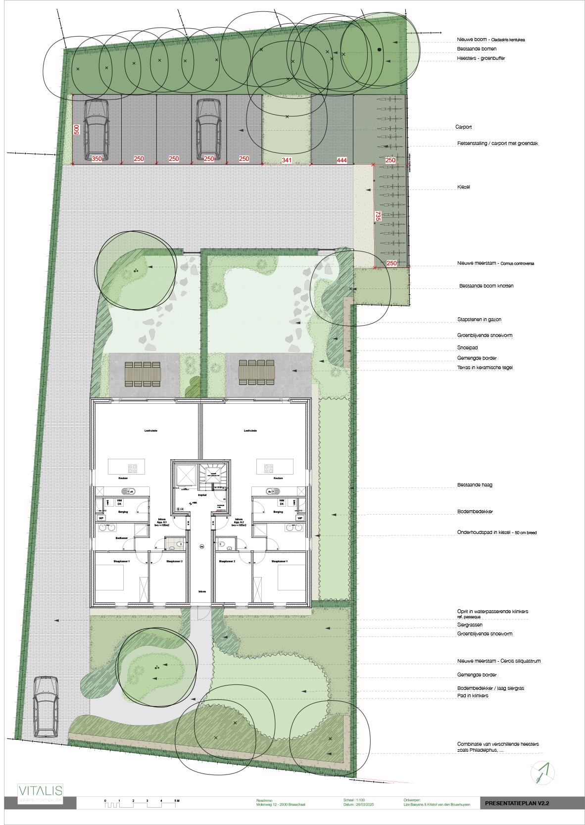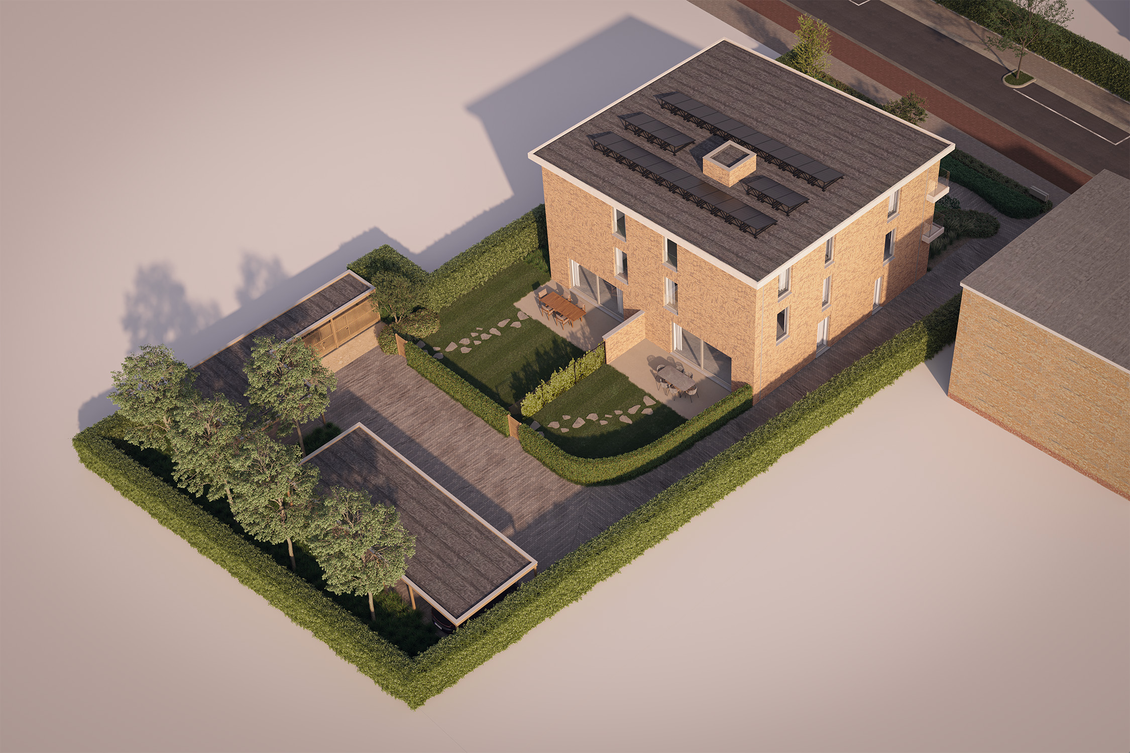 Elk appartement beschikt ook over een eigen privatieve kelderberging en een carport achteraan het project, te bereiken via de inrit links. Achteraan bevindt zich ook de gemeenschappelijke fietsenstalling en afvalberging.